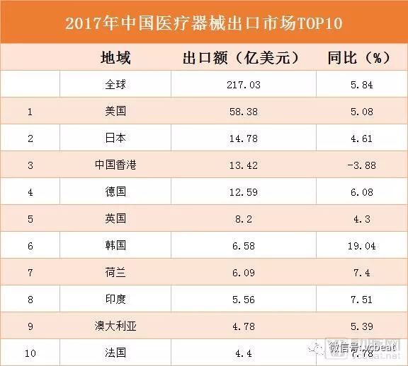 据中国海关统计数据,2017年,我国医疗器械出口总额达到217.03亿美元,同比上涨5.84%,创历史新高。其中,对美国出口额为58.38亿美元,同比增长5.84%。