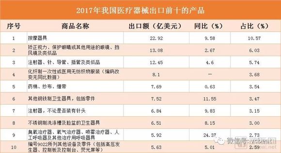 出口额虽然增长,但目前我国出口的医疗器械产品中,仍以低值耗材、中低端产品为主,产业对原材料和劳动力等低成本要素依赖很大。以按摩保健器具、医用耗材敷料为主的前十大出口产品,占据我医疗器械出口总额的44.5%。