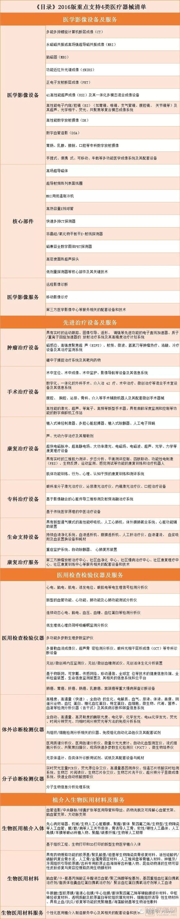 同时,在医疗器械产业上,《目录》2016版划定了四大重点方向,包括医学影像设备、先进治疗设备、医用检查检验仪器和植介入生物医用材料,将被重点支持。