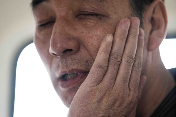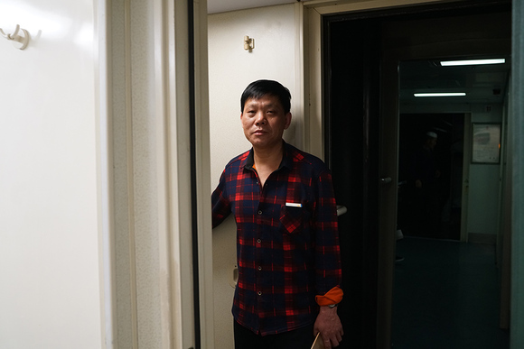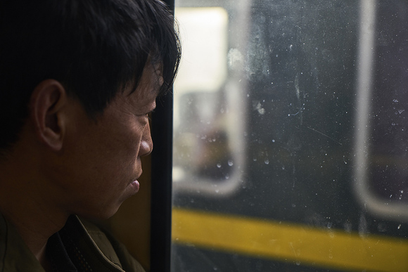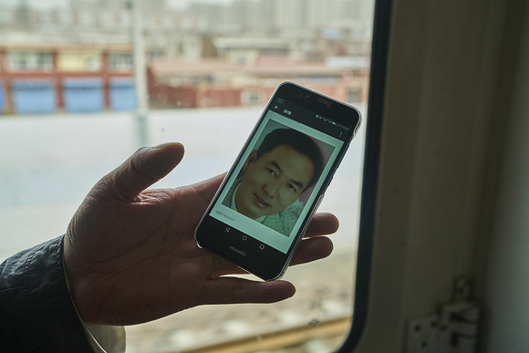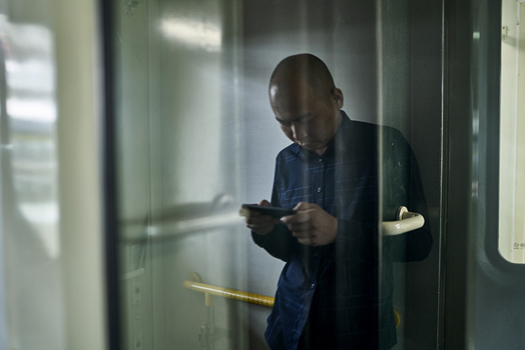 王海的眼神始终有些警惕。直到打开话匣子,他不经意间用手遮着脸的“小动作”才开始多了起来——像很多在这里被拍下的人一样,王海觉得自己因为面瘫的缘故,甚至看上去有点丑。“十年前说帅可以,现在眼皮塌了”。实际上,他有着内蒙人标志性的高耸鼻梁和浓郁眉毛,脸上的褶皱像极了车窗外风景中的地理纹路。高大的个子,使得车厢连接处的空间显得狭小而局促。
