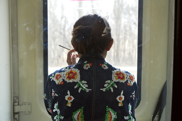K885次列车,从天津发车后途径十七站才到达西宁,总里程超过两千公里,用时三十三小时零二十二分。同样的起始和终点站,选择高铁与飞机的组合的话,只需要六个小时。人们多是图了线路与时间上的方便而搭乘这一趟速度缓慢的列车,也有经费不足的无奈之举。然而不论他们如何消磨这或许漫长的时光,他们总会有机会来到列车中的“公共空间”——车厢连接处。对于K885次列车来说,让人在连接处停留的最大魅力,可能是专属于慢车的吸烟权利——对于不抽烟的人来说,这里是一个车厢去往另一个车厢的通道,也是卫生间与盥洗室的所在地,可能吃泡面的时候才会来这里接上一碗滚烫的水;而对于吸烟者来说,这样的普通列车虽然因为缓慢的速度拉长了旅程,却价格低廉,且不必忍受无法吸烟的难耐状态——烟雾缭绕中,他们或许可以享受一个人孤独的乐趣,与亲人通个电话,或与同行人闲聊几句。