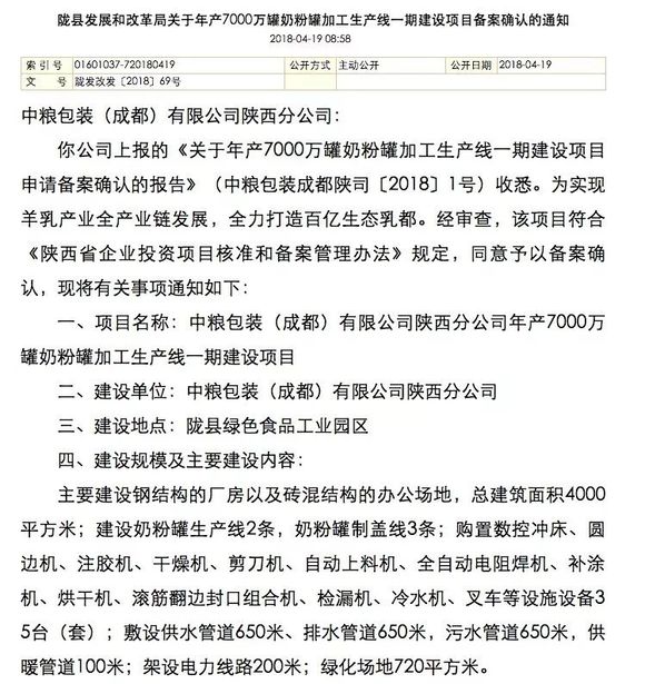 陇县发展和改革局昨日最新公开的一份通知(上图)显示,中粮包装(成都)有限公司陕西分公司上报的《关于年产7000万罐奶粉罐加工生产线一期建设项目申请备案确认的报告》(中粮包装成都陕司〔2018〕1号)该局已经收悉。