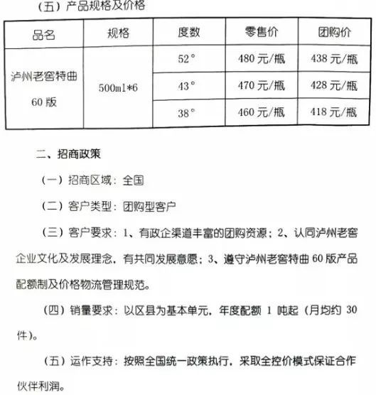首先,在价格方面,在2017年12月7日出具的上述这份《泸州老窖特曲60版团购招募计划》中显示:52度特曲60版的零售价在480元/瓶,团购指导价为438元/瓶。成都某终端店老板对微酒记者指出,“虽然特曲60版指明购买率较高,但经销商加上费用等成本接近400元,整体利润不是很高。”显然,这一次零售标杆价提升目的之一也是为了增加渠道利润。