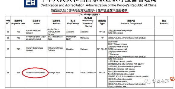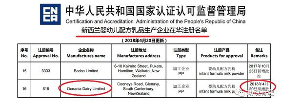 根据认监委官方公布的信息显示,4月20日,新西兰再添一家在华注册的婴幼儿奶粉生产企业,名为Oceania Dairy Limited(大洋洲乳业有限公司),注册编号为818。据了解,大洋洲乳业有限公司为伊利在新西兰投资的全资子公司。