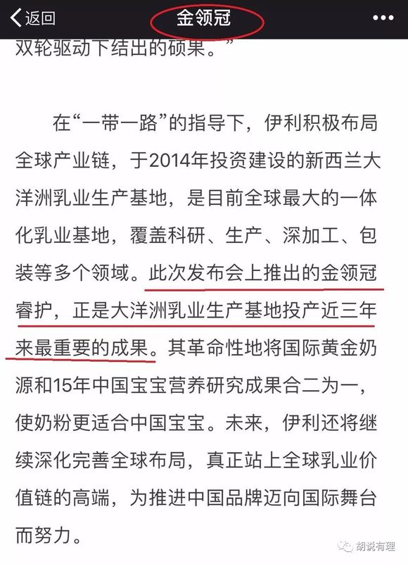公开信息显示,2017年6月2日,金领冠睿护原罐进口奶粉上市发布会在京举行,账号主体为“伊利股份公司金山分公司”的微信公号“金领冠”去年6月2日发文称:“伊利积极布局全球产业链,于2014年投资建设的新西兰大洋洲乳业生产基地......此次发布会上推出的金领冠睿护,正是大洋洲乳业生产基地投产近三年来最重要的成果。”