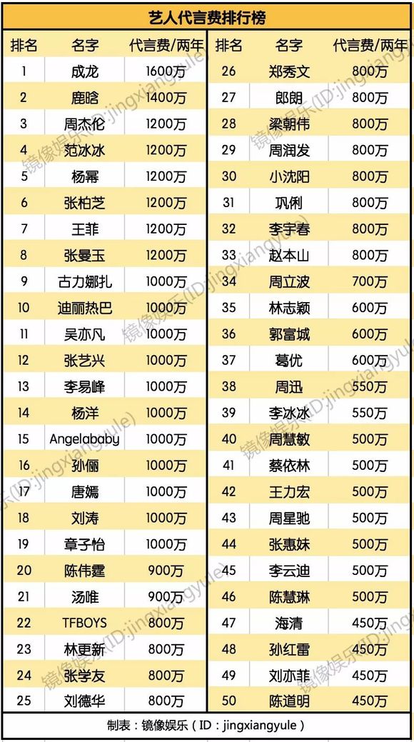巨大人气下,品牌商纷纷找到鹿晗代言。因此鹿晗也成了目前仅次于成龙的天价代言人。在多方调研、采访后,镜像娱乐(ID:jingxiangyule)整理出了艺人代言费排行榜TOP50。