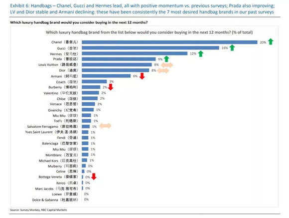 近来加拿大皇家投资银行(RBC Europe)的一项调查显示,Chanel(约有20%的受访者表示希望购入)和Gucci(约16%)成为2018年度最受奢侈品消费者欢迎的名牌包。仅次于这两个品牌的是Hermès(12%)、Prada(9%)、Louis Vuitton(8%)、以及Dior(8%)。如果不考虑预算限制的话,受访者们表示Hermès为他们最希望拥有的品牌。中国消费者们相当尊敬该法国传统品牌的世界级工艺。