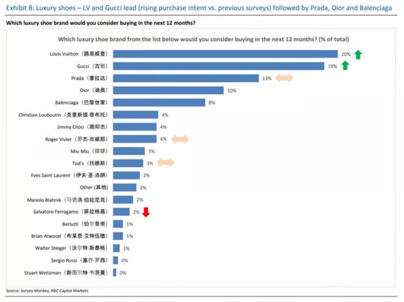 奢侈鞋种类方面,Louis Vuitton(20%)和Gucci(19%)领先;Prada(13%)、Dior(10%)、Balenciaga(8%) 紧随在后。但消费者对Christian Louboutin、Jimmy Choo、Roger Vivier 及Manolo Blahnik这些专业奢侈鞋制造商表现出的兴趣反而较少。意大利鞋类品牌Salvatore Ferragamo今年已被标记 “面临压力”。然而就在不久前,此品牌还是中国消费者 “最受欢迎的前五名鞋牌” 之一。