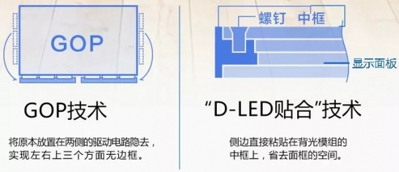 据HEA了解,单体消费品类中的全面屏电视则是采用“GOP”与“D-LED贴合”技术,将原本放置在两侧的驱动电路隐去,侧边直接粘贴在背光模组的中框上,省去面框的空间,实现左、右、上三个方面无边框的占比。因此,全面屏电视给人感觉是一眼看上去有没有想悬浮在空中的一张大屏幕,达到几乎无边框的效果。而另外一个事实是,全面屏电视比的屏占比值远远超过全面屏手机。