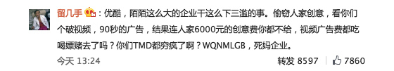 由于这些原创作者们本身已有几十万粉丝,转发后事态开始升温发酵。两小时后,网络红人@留几手和暴走漫画主编@王尼玛也纷纷加入声讨优酷和陌陌的阵营中。