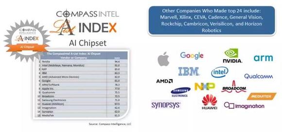 今天,市场研究顾问公司Compass Intelligence公布了全球100家AI芯片企业排名,其中,排名第22位的正好是来自中国的中科寒武纪。前三名为英伟达(Nvidia)、英特尔(Intel)以及恩智浦(NXP)。
