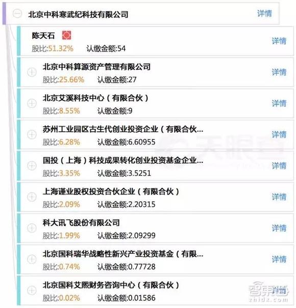 以下是目前北京中科寒武纪的占股名单,其中“国投(上海)科技成果转化创业投资基金企业”和“北京国科瑞华战略新兴产业投资基金”为2018年1月15日新增的。