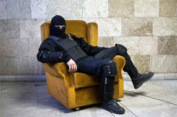 4月25日,一个带着面罩的亲俄罗斯抗议者坐在乌克兰顿涅茨克当地政府大厦里的一张椅子上。(图片来自Marko Djurica)