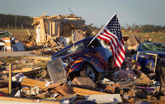 4月28日,美国阿肯色州遭遇龙卷风,损失惨重。在Vilonia市郊,一面美国国旗正好插在一辆被龙卷风摧毁的汽车车窗处。(图片来自Carlo Allegri)