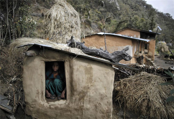 2月16日,14岁的Uttara Saud坐在尼泊尔西部Legudsen村的棚屋里。这是当地村落的传统习俗,妇女在生产期间及月事来潮时不得进入家门,只能在简陋的棚屋居住。(图片来自Navesh Chitrakar)