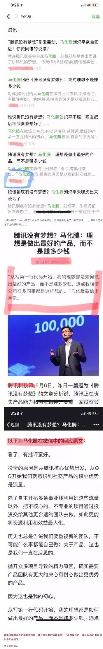 2、5月6日凌晨2点多,一张马化腾微信回应此事的截屏开始流传,(大叔看到是在6日中午左右了),并被众多媒体、自媒体、大V引用,作为继续讨论的依据。
