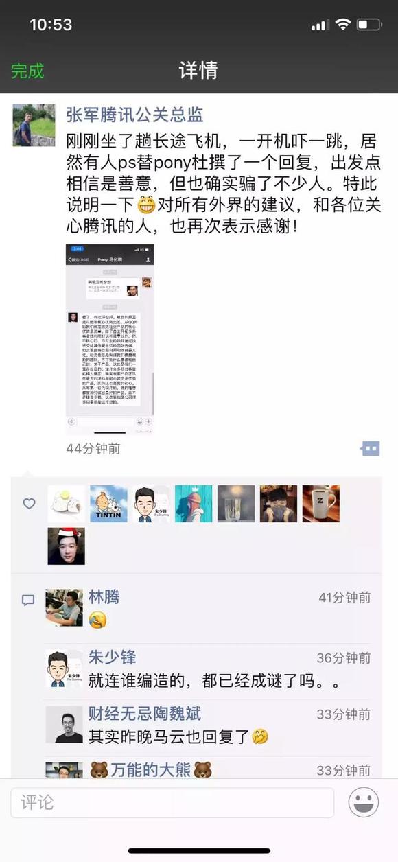 4、5月6日22点09点,腾讯公关总监张军在其朋友圈证实,此截屏为假: