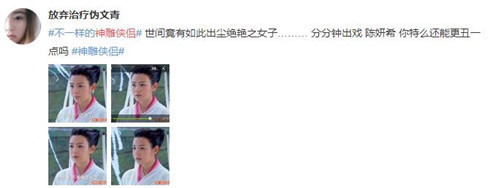 在第二集快结束的时候,女主角陈妍希版的小龙女终于飞了出来,我直接一口老血喷在屏幕上……都已经是包子脸了,化妆师你还给人头顶扎两角,露出整张大圆脸,安得什么心啊这是。