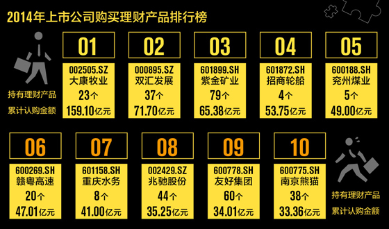 2014年1月1日至2014年11月25日,A股市场上共有377家上市公司购买理财产品,共计持有3259个,累计认购金额达2534亿元(今年以来购买过理财产品的总金额,一笔资金滚动多次购买短期理财产品的重复计入总金额,下同)。