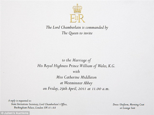 与婚礼蛋糕一同被拍卖的还有威廉王子和凯特王妃婚礼的一个空白喜帖。喜帖上面印着”女王伊丽莎白二世的白金汉宫“的字样。”女王命令宫务大臣邀请__参加威尔士威廉王子殿下与凯瑟琳•米德尔顿小姐于4月29日星期五上午11:00点在威斯敏斯特大教堂举行的婚礼。衣服:制服、燕尾服或套装。”