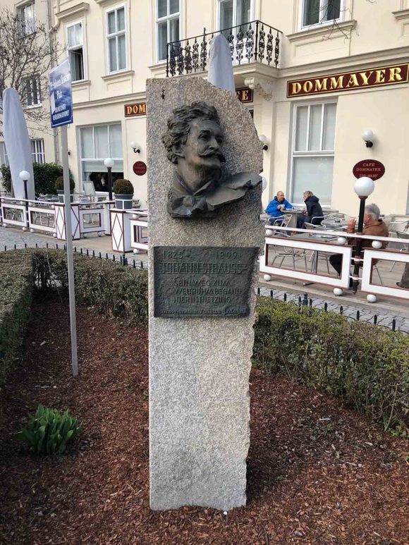 咖啡馆文化是奥地利一大特色,维也纳的咖啡馆多如牛毛。最有名的一家要数中央咖啡馆(Café Central),那是奥匈帝国时期文人墨客聚集的地方,弗洛伊德、胡戈·冯·霍夫曼斯塔尔、施尼茨勒、卡夫卡、茨威格,甚至列宁和托洛茨基,都是那里的常客。我和“黑黄联盟”会面的地点是维也纳席津区的多姆迈尔咖啡馆(Café Dommayer)——约翰·施特劳斯父子和约瑟夫·兰纳(Josef Lanner)都曾在此演出,店门口的纪念碑上写着:“小约翰·施特劳斯的世界声誉从席津开始” 。