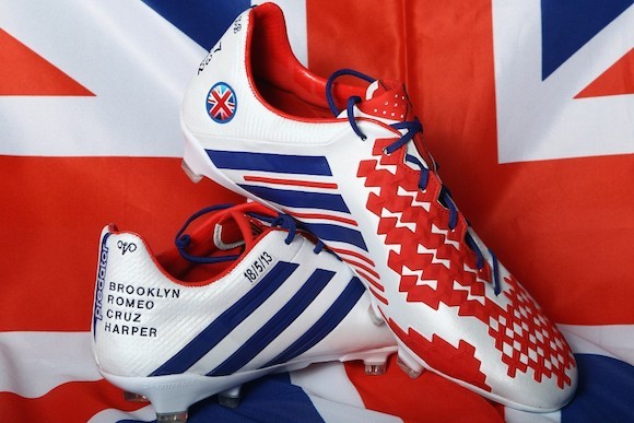 下图为小贝2013年参加最后一场职业球赛之前在mi adidas上定制的球鞋,整体采用的是英国国旗的色调。