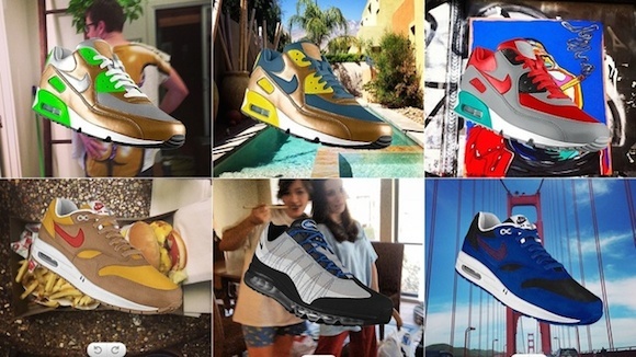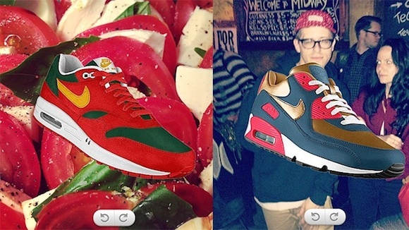 2013年耐克推出定制服务“Nike PHOTOid”。它的具体做法是,点击进入Photoid.Nike.com后,允许该网站获取个人Instagram的照片,再从中选择某一张做成鞋子。可供选择的款式只有三种,而该网站会根据你所提供的照片提供4种不同的颜色组合方式,你可以从中选择自己中意的一款。完成品的效果是这样的:
