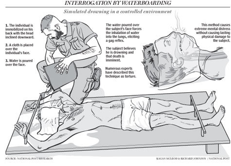 这种手法被形容为“近乎溺死”。囚犯会被绑在长椅上,长椅一端被抬起,导致他们的腿会抬得比头部高,鼻子和嘴巴被布蒙住。探员会不断拿水浇布,阻止呼吸,模拟溺水时的场景。