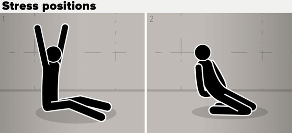 囚犯Zubayadah曾被要求做了两种姿势:一种要求他坐在地上,双腿在身体前张开,同时双手要举过头顶;第二种姿势式要跪在地板上,同时向后仰身45°。