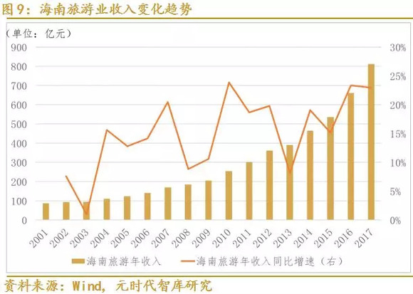 2008 年,中国为应对金融危机提出了经济结构转型的目标,经济增长动力由外需转为内需。在此背景下,海南省结合自身产业发展情况,把旅游业定位为战略产业,大力发展旅游业及其相关产业,旅游业收入稳步增长。2017年海南旅游年收入达到811亿元,并以20%的增速高速增长,以此发展速度,到2019年旅游收入就将超过1000亿元,这将比海南十三五规划中提出的“2020年海南旅游业收入达到1000亿元”提前一年完成。