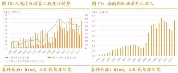 旅游收入的构成方面,从游客来源看主要分为境外游客和国内游客。从2000年以来,入境游客人数快速提升,但旅游外汇收入总量依然较低。这和海南缺乏高端旅游产品、国际化旅游产品和特色化旅游产品供给不足有关。目前,海南省从旅游产品供给端进行发力,如打造100个特色产业小镇,以及开发海岛游、引入国际赛事和体育彩票等高端旅游业态等。新产品供给加上新的免签政策叠加影响,将进一步提高入境游客数量及消费水平。