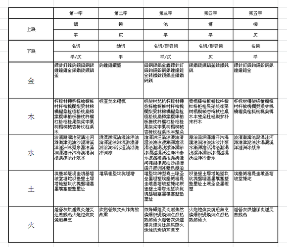 先用字典把所有带“金木水火土”偏旁的字都找出来,归类。然后设定音韵和词性的条件,编程进行五个字的随机组合。就像这样: