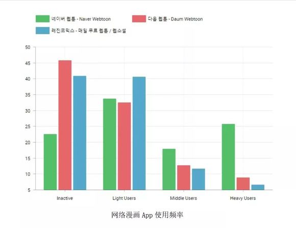 根据月平均使用天数,可以将平台用户划分为不活跃用户、轻度用户、中度用户、深度用户不同的等级。如图表数据显示,在国内,Daum Webtoon和Lezhin Comics 的不活跃用户和轻度用户所占比例相对较高,而Naver Webtoon的中度用户和重度用户的占比则为最高。