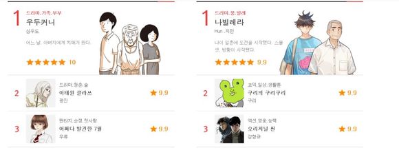 而 Naver Webtoon 每年举办的挑战联赛以及设置的“最佳挑战”、“挑战漫画”等专题版块就在优秀新人作者以及作品的发掘方面起到了很重要的作用。以此为基础,Naver Webtoon 的连载以及完结作品数量在国内也处于领先地位,并推出了众多人气作家以及热门作品。
