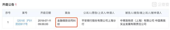 但值得注意的是,除了持股公司北京黄金的5亿信托贷款被爆构成实质违约外,该公司也存在不少金融借款类的法律诉讼。将在2018年7月11日开庭的一场官司中,中青旅实业就和平安银行股份有限公司上海分公司产生了金融借款合同纠纷。