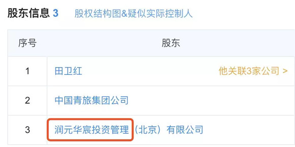 中青旅集团不用多说,股东田卫红除了中青旅实业外,还投了一家批发零售的公司。至于认缴出资比例最多的润元投资,股东背景就比较复杂。
