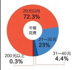 1.七成白领午餐不超过20元。报告显示,72.3%的白领午餐支出在20元以内,由于现在写字楼配有食堂的大部分都是国有企业或者超大型集团,这里说的20元一般情况来说就是普通人外出吃饭的主要花费,再加上21元-30元之间的有23%,这就直接意味着超过9成的白领午餐支出在30元以内,假设以北上广深等一线城市为例,30元之内的午餐根本称不上丰盛,只能说是勉强糊口而已,甚至有不少白领表示,要控制自己的饮食支出,超过20元的午餐就很可能超支了。