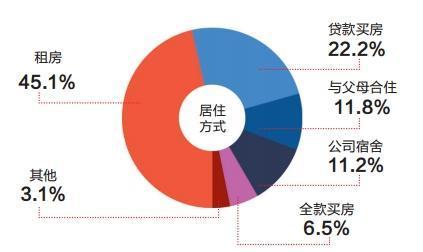 2.租房是白领主要的生活方式。根据统计,45.1%的白领以租房为自己的生活状态,再加上11.8%的与父母合住,11.2%的公司宿舍,真正拥有自己住房(无论全款还是贷款)的白领只占所有人比例的28.7%,在这个里面真正全款买房的有钱人只有6.5%。北上广深等买房压力大的一线城市,租房群体更庞大,北京租房生活的白领占58.6%;上海为57.3%;深圳则高达68.8%。