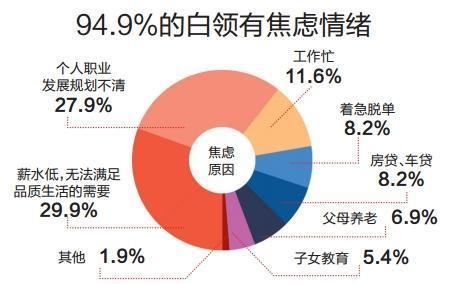 5.绝大多数白领感到焦虑。在调查中,94.9%的白领有焦虑情绪,针对焦虑的具体来源调研显示,占比最高的选项简单概括就是“又穷又迷茫”。而最让白领焦虑的新闻类型则包括,“全国各城市平均薪资又来扎心了”(25.1%)、“00后已经开公司了”(16.2%)、“房租又要上涨了”(15.3%)、“95后都当妈了”(10.3%)。