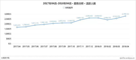 2018年3月,保监会与银监会合并成立了中国银行保险监督管理委员会,二者的合并有利于整合资源、发挥各自的监管优势,提升监管质量和效率,形成协同监管效应,对互联网保险的行业规范发展具有一定的保障性作用,加之多个互联网保险服务应用在营销及运营活动上的方面的投入,使得2018年4月互联网保险活跃用户进一步增长,并达到2790.3万,超过了年初数。