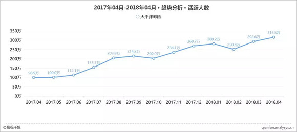 活动运营、产品创新等促进太平洋寿险活跃用户整体保持快速增长,2018年4月活跃用户为315.49万,环比增长7.81%,在保险服务领域渗透率达到11.31%。在用户运营上,太平洋寿险推出了团玩节、体检关爱季、趣跑、AR聚宝盆和实景寻宝等丰富的活动将App线上用户引入线下参与活动探索线上线下相结合的保险用户经营方式,提升了产品和品牌内涵,将活动与产品和服务融合。在产品迭代方面,推出了普惠保险产品“安贷宝”、 智能客服、太e赔、电子保单等富含金融科技技术的产品及服务,显著提升了客户体验。