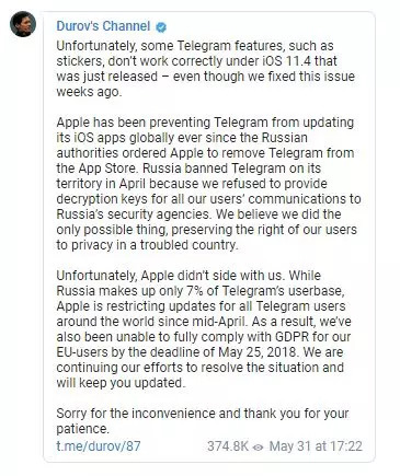 虽然受到庞大的民意压力,俄罗斯政府并未停手。监督局要求苹果从App Store 删除 Telegram,让俄罗斯人没办法下载 Telegram。不过另一方面,Telegram 创办人 Pavel Durov 宣称苹果在收到俄罗斯当局的命令之后,就不再让 Telegram 更新 iOS 版的应用程序,而且影响范围不只是俄罗斯而是全世界。Durov 认为这代表苹果没有站在 Telegram 这一边,共同捍卫用户的隐私权。无法更新也导致 Telegram 无法完全符合欧盟新的 GDPR 隐私法规,不过 Durov 也表示将努力处理这个问题,并感谢用户的耐心等待。
