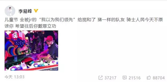 6月1日,李易峰更新微博,晒出一张片场花絮照,配文:“儿童节,全被jr的‘我以为我们领先’给搅和了,猪一样的队友,骑士人民今天不原谅你,希望往后你戴罪立功。”
