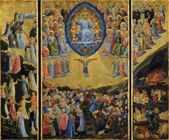 天堂,即意味着“面对面”目睹上帝,而不是隔着一层“昏暗的玻璃”。这是以上帝或天国基督为中心的永恒。因此,由弗拉·安吉利科(Fra Angelico)创作的《最后的审判》(The Last Judgement,1425-30),内容便是坐在宝座上的基督,周围被天使、玛丽和圣徒环绕。他的右手指向天堂,左手指向地狱。在基督的右边,天使带着得救的人穿过天堂花园,来到城墙环绕的天国之城,而在基督的左边,恶魔则把恶人赶进地狱。
