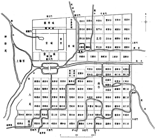 和纽约不同,洛阳数字上的富有与奢华并不为所有洛阳人所感知,它的质量也不总是在表面就清晰可见,在我们美谀它的纪念碑和浮华生活之前,需要首先穿越这座城市不甚悦目的部分。同样是方格画就的城市愿景,洛阳的街区——里坊的个儿要大得多,而且被严严实实地堵在一圈夯土砌就的坊墙里,就像一个坏了的水果被捂出酒味来;城墙是灰黄的,街道是灰黄的……它们的尺度和用途更不可相提并论:因为某种下面我们需要深究的原因,在洛阳宽达百步的铜驼街上,今日小女生手牵着手逛街的场面大概是看不到的。都是“网格城市”,“巨型街区”只能默默向内发展,其他文明的城市“里坊”,比如日本平安时代以来的“两面町”“四面町”,却是一开始就确定好了人际使用的街道界面,它们的感受显然是非常不同的。
