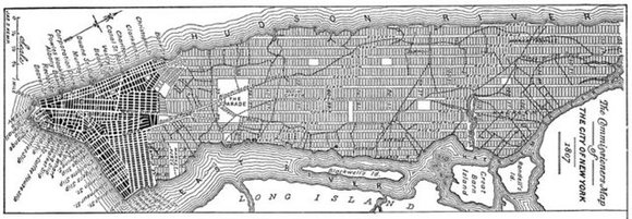 一千三百多年之后的1807年,在欧洲人新发现的北美大陆东岸,几个新移民,西米恩. 德维特(Simeon deWitt)、古弗尼尔. 莫里斯(Gouverneur Morris) 和约翰. 拉瑟福德(John Rutherford)受托规划另一座城市。自此以往,人们将可以方便地管理他们将要开发的哈德孙河中的一座岛屿,四年之后,在“将已知区分于未知的疆域内”,他们规划了12条由北向南的大道和155条由西向东的大街。