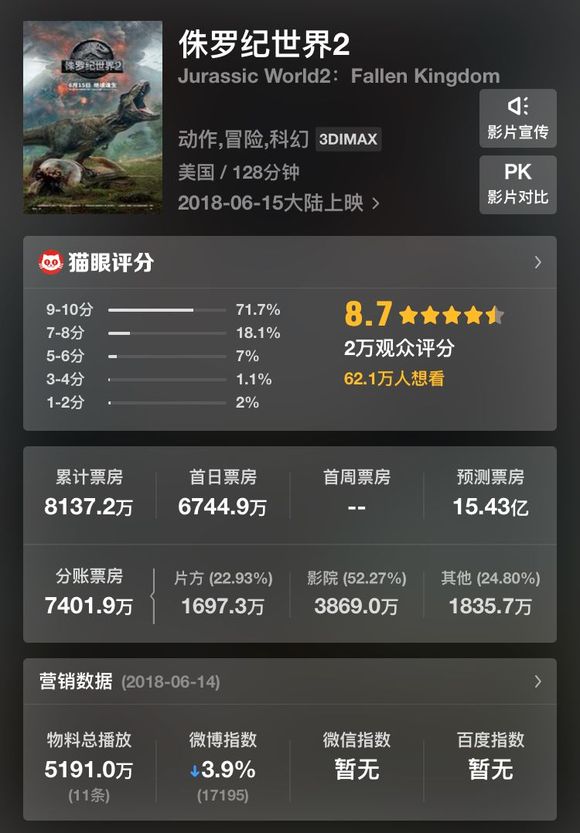 截至到目前,《侏罗纪世界2》的首日票房已经达到了8000万+(包括预售),在猫眼上有62万人标记想看,这个成绩仅仅落后于《复联3》和《后来的我们》,在电影市场遇冷一周之后,凶悍的恐龙真正引爆了人们的观影热情。