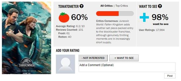 各家的评分也相继出炉,在烂番茄上目前是61鲜40烂,只有刚刚合格的60%新鲜度,观众想看指数倒是相当之高。