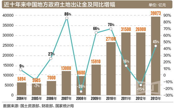 土地财政已进入重要的拐点期。按照中国财政部2014年7月发布的《2013年全国财政决算情况》显示,2013年,中国土地出让金收入决算数为3.9万亿元,是预算数的152.6%,地方政府的土地出让金收入再创历史之最。虽然截至界面新闻发稿前,财政部尚未发布2014年全国土地出让金收入汇总数据,但是,根据上述市场研究机构给出的最新报告,如果按照同比例缩减,2014年全国土地出让金将大幅缩水,对于地方政府而言,将是极大的考验。