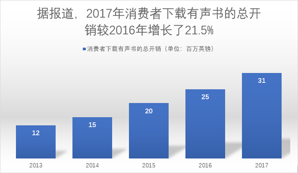 根据出版商联合会(Publishers Association)的统计数据,2013年以来,有声书方面的开支几乎翻倍,至2017年已从原先的1200万英镑增长到了3100万英镑。
